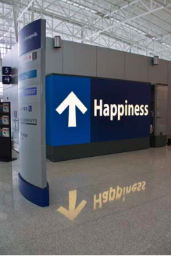 Happiness, a site-specific project for IND, mimics the airport signage style and video-graphics aesthetic to comment on our reliance on signs for locational directions. The sign purportedly directs us to “happiness,” raising the question of whether that is a state that is so easily accessible. The exhibit is housed in the North Ticket Hall display case.